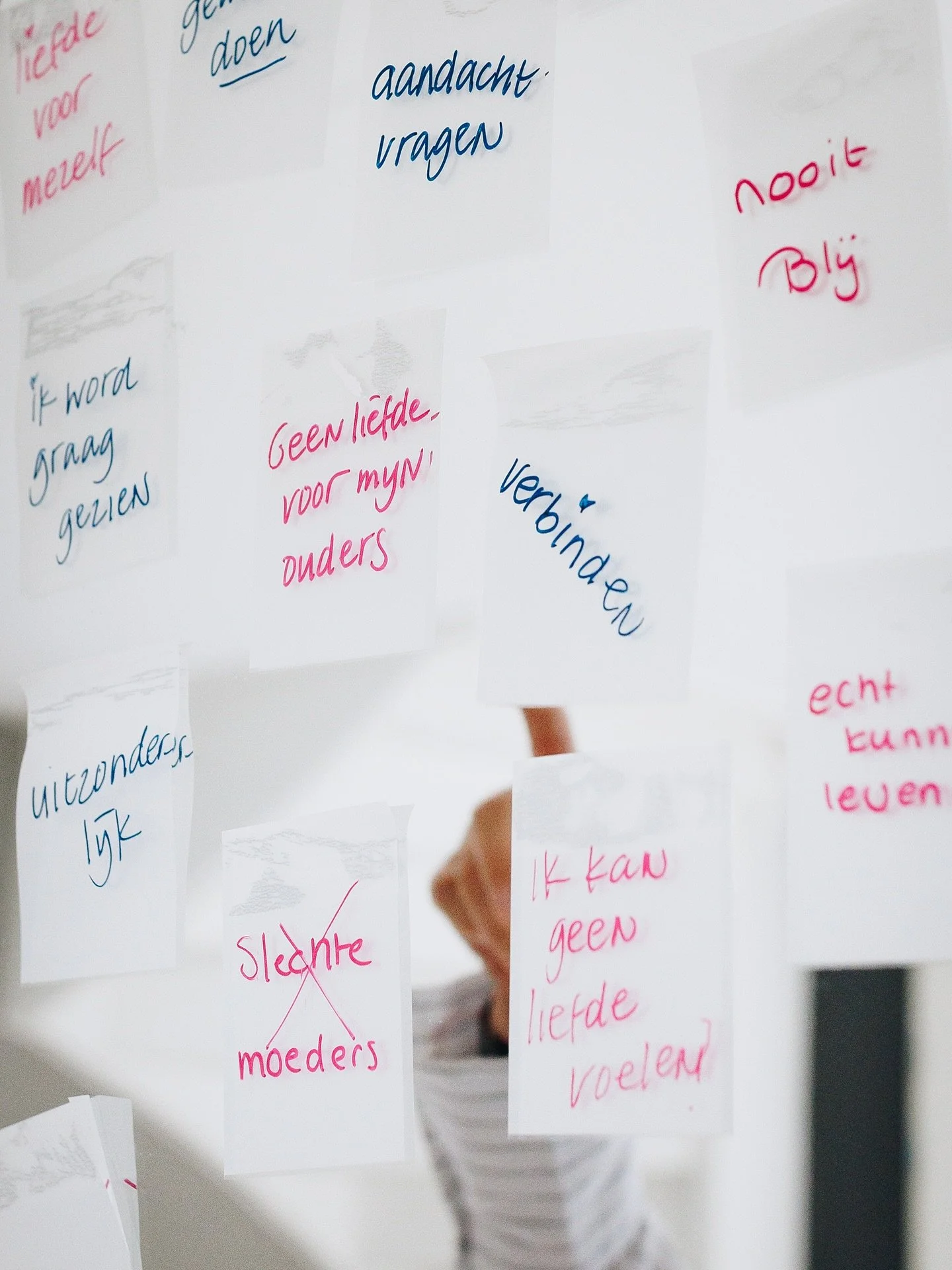 We kijken naar foto’s van jou, naar je spiegelbeeld en we maken nieuwe foto’s. We maken je overtuigingen, mindset en gedrag zichtbaar. We schrijven je kernovertuigingen op en plakken deze op de spiegel. Het gesprek dat daaruit ontstaat vormt de kern van de sessie.